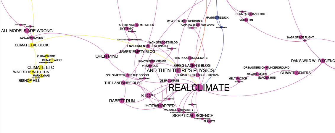 At Judith Curry they think like WMC above :) and mainly complain about the size of their cluster and I am the boogieman responsible for this size. While I did not mention the size on purpose, the sizes are easy biased by who the survey got too. If more mitigation sceptics' blogs were sampled more links may have appeared, but it seems likely that it would remain a highly self-referential cluster.
