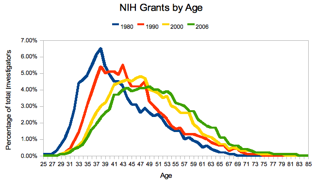 Via Tyler Cowen, comes this graph of demographic shifts in NIH grants, which show a clear trend: older scientists are getting more money.