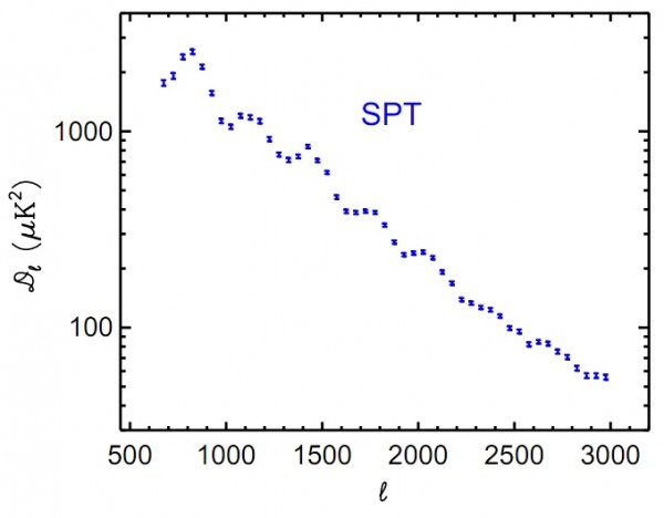 But what goes on out past where WMAP can measure, at those very small angular scales? WMAP is no good at measuring that; we'd need a specialized mission for that. Luckily for us, the South Pole Telescope was designed especially for just such a task.