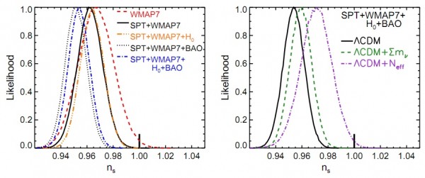 2.) The scalar spectral index, ns, is very well measured to be less than 1! When you add in the newly-measured South Pole Telescope data, we find that ns = 0.9623 ± 0.0097, which is the strongest evidence yet for inflation based on the scalar spectral index! This might not sound as exciting to you as it is to me, so let me phrase it in slightly different terms: