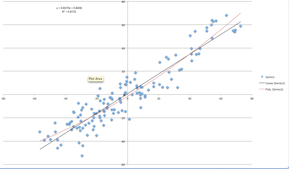 Yeah, I know, no axes lables. This is just a quick and dirty exercise in Science by Spreadsheet! This is June temperature anomaloy on the X axis and annual on the Y. The black regression line has the indicated R-squared and model formula. I added a second order polynomial regression line (in red) to check to see if the ability to predict goes haywire for the higher temperature values (which are also the more recent years). I'm going to say it doesn't, though if we do a similar model regressing the second half of the year on the first, there is a skew with the higher (and thus later) values: