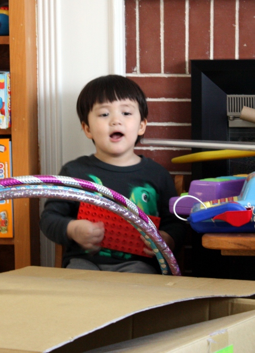 And, for balance, here's a shot of The Pip singing "The Wheels on the Bus" accompanying himself by strumming a Duplo base plate: