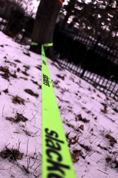 One of our Christmas presents for the kids was a slackline kit, which they wanted set up pretty much the instant I got home. So I put it up over the weekend, and on consecutive days got these pictures:
