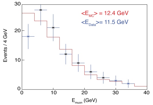 By measuring the angle shown in the image above, they can reconstruct the energy of the muon that created this signal. Over the past year or so, they've observed just over 100 events; not a statistical goldmine, to be sure, but enough that they can compare their data (blue dots, below) with the expected event distribution (red line) from Monte-Carlo simulations.