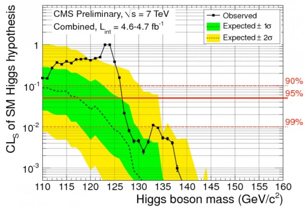 So what we do is we compute what the probability of having each type of result is with all the known particles (i.e., without the Higgs), then we do our collisions, record the data, and compare what we get with what we think we should get. The first machine to really get into this game and put something significant out was the Large Hadron Collider (LHC), which released its preliminary results late last year.