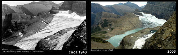 Grinnell Glacier and Salamander Glacier used to be part of the same glacier, but have not only separated, they have shrunk dramatically. In particular, Grinnell Glacier has lost 40% of its area from 1966 to 2005, and continues to shrink today.