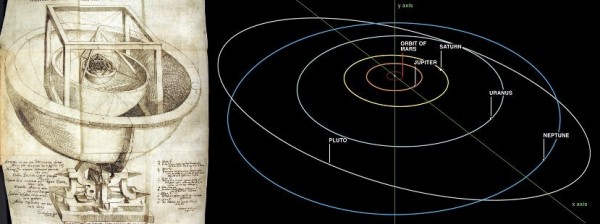 Johannes Kepler's Mysterium Cosmographicum, 16th Century (left), from his notebook, and his later, more successful 17th Century model (right) of elliptical planetary orbits. Images credit: J. Kepler (left), Phillip Brown and James Braselton (right).