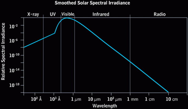 The Sun is, to use a tried-and-true metaphor, hot as hell. At least, that's true insofar as we can assume hell has a surface temperature of nearly 6,000 Kelvin! This radiation -- like pretty much all radiation -- has a very particular energy distribution known as (approximately) a blackbody distribution. (There's a little extra at very high wavelengths due to the effects of the Sun's atmosphere.) This ensures that the vast majority of the light that comes from the Sun peaks in the ultraviolet, visible, and infrared parts of the spectrum. That's what you'd get for pretty much anything you heated up to a temperature of 6,000 Kelvin: an energy spectrum that looks like this.