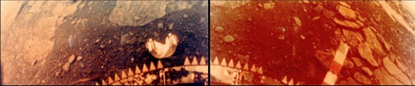 These are the only photos (I know of) ever taken of a lander on the Venusian surface: the Venera 13 lander, which survived a whopping 127 minutes on the scorching 2nd planet from our Sun. (Its sister, Venera 14, survived for a respectable 57 minutes.) That's not bad, considering that Venus' surface is hot enough to turn metals like lead to liquid in a matter of seconds!