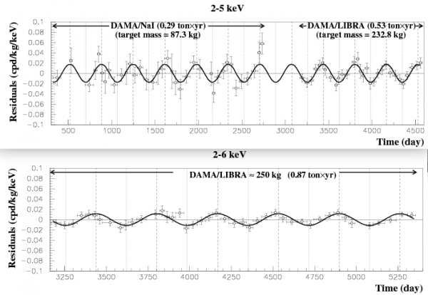 Images credit: DAMA collaboration, from Eur.Phys.J. C56 (2008) 333-355 (top) and DAMA/LIBRA collaboration from Eur.Phys.J. C67 (2010) 39-49 (bottom). The annual modulation is real and robust, but its cause is unknown.