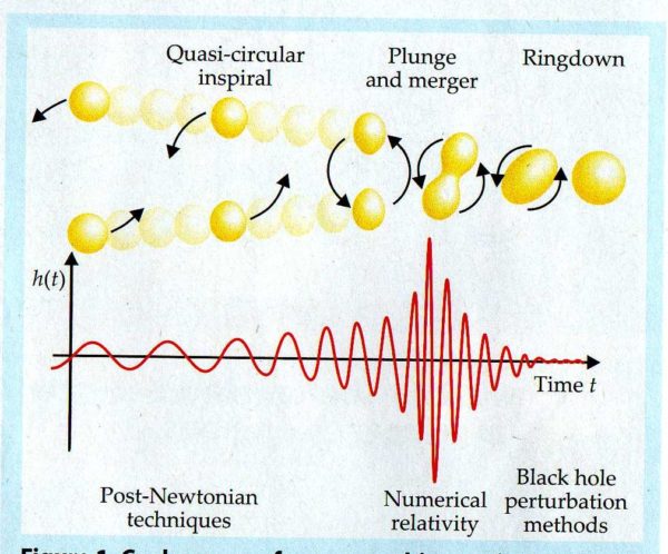 Inspiral, merger and ringdown phases of a binary black hole merger. Image credit: Baumgarte and Shapiro 2011.