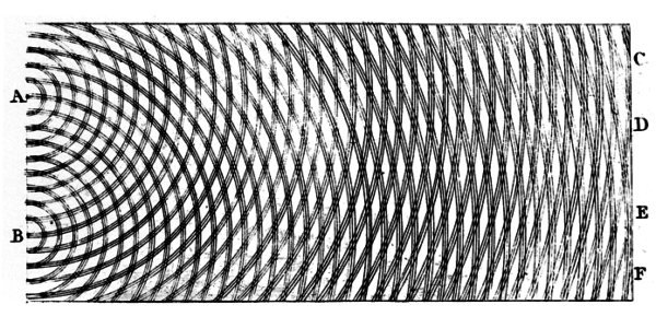 The wave-like nature of light passed through two slits, as illustrated by Thomas Young's original work, dating from 1803. Image credit: Wikimedia Commons user Quatar.