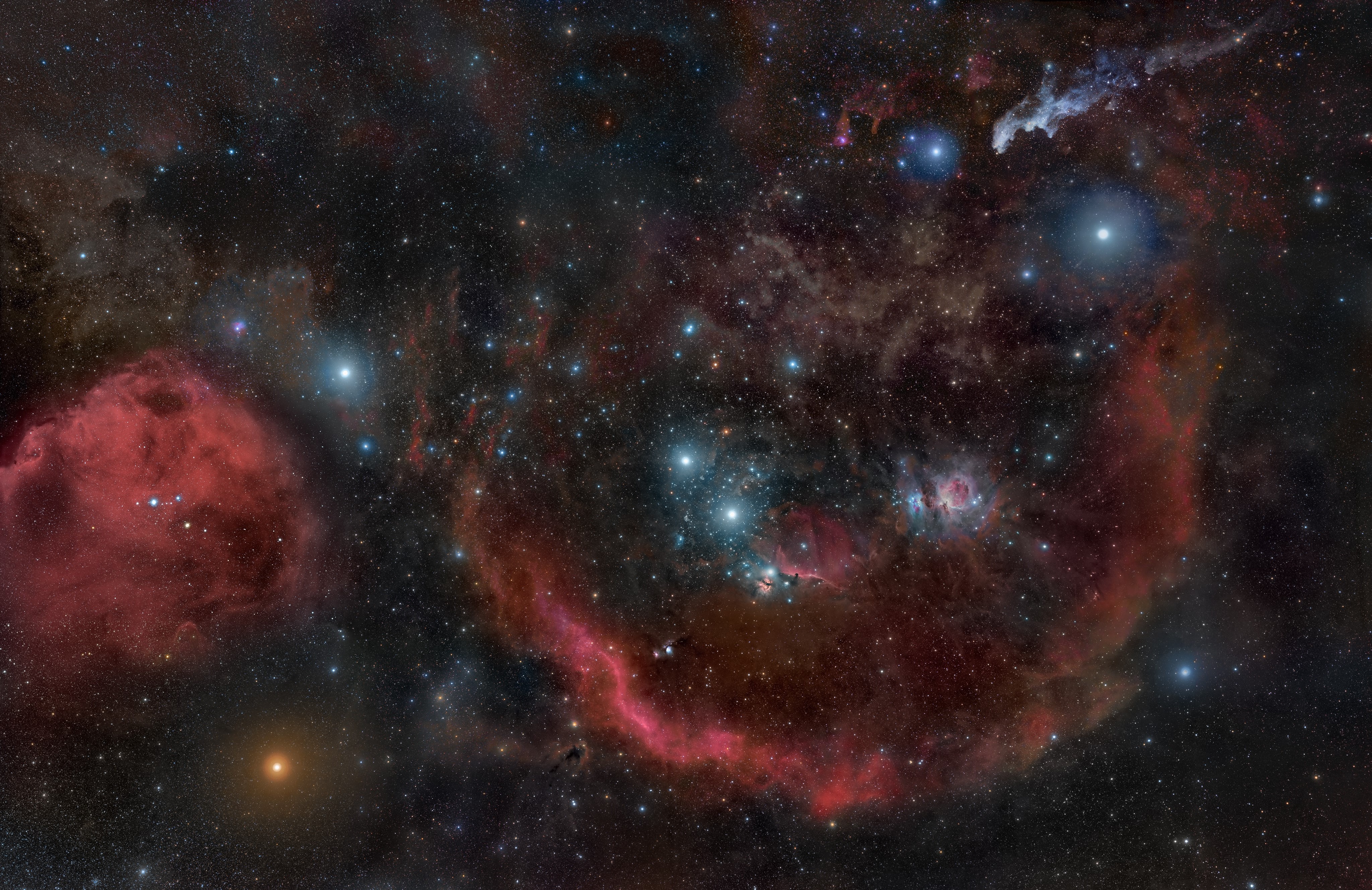 The constellation of Orion, along with the great molecular cloud complex and including its brightest stars. Betelgeuse, the nearby, bright red supergiant (and supernova candidate), is at the lower left. Image credit: Rogelio Bernal Andreo.