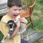 Well, first there's the baby goats. Last Friday, we collected our foster goat, Tayish. He belongs to a friend from our synagogue who won him in a raffle, believe it or not. He's a 10 week old wether, and the kids have made a pet of him. Here's Simon holding him: